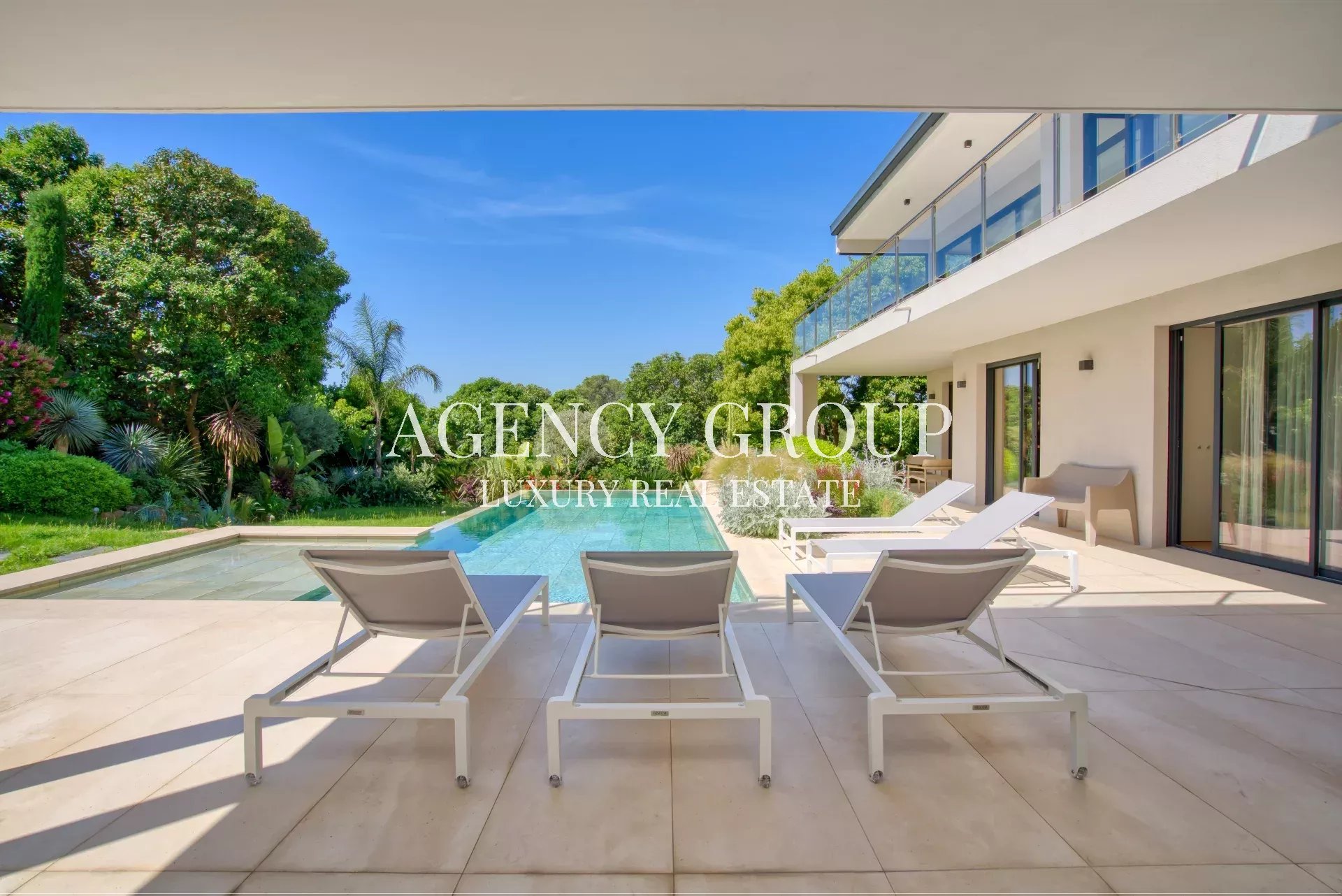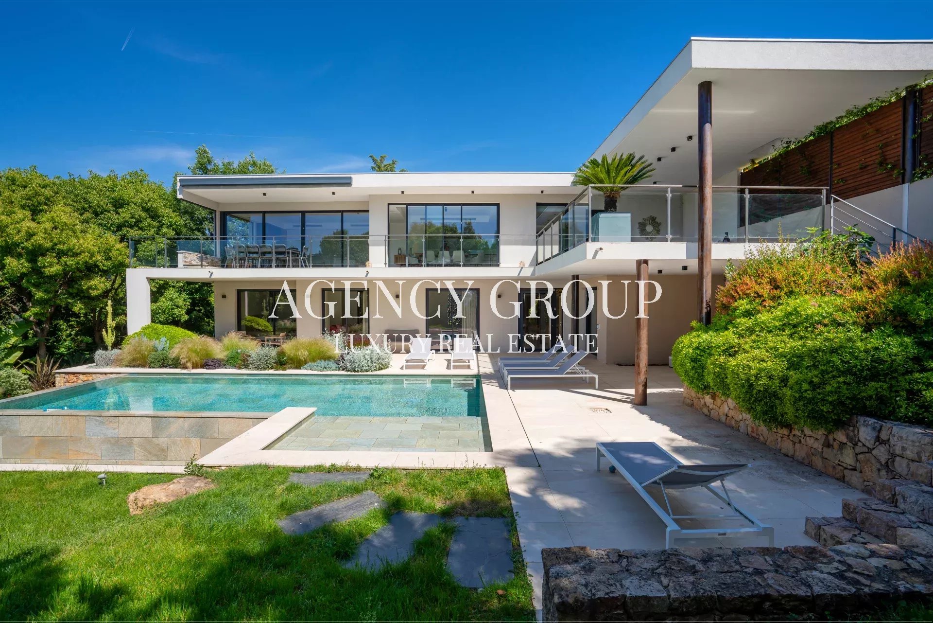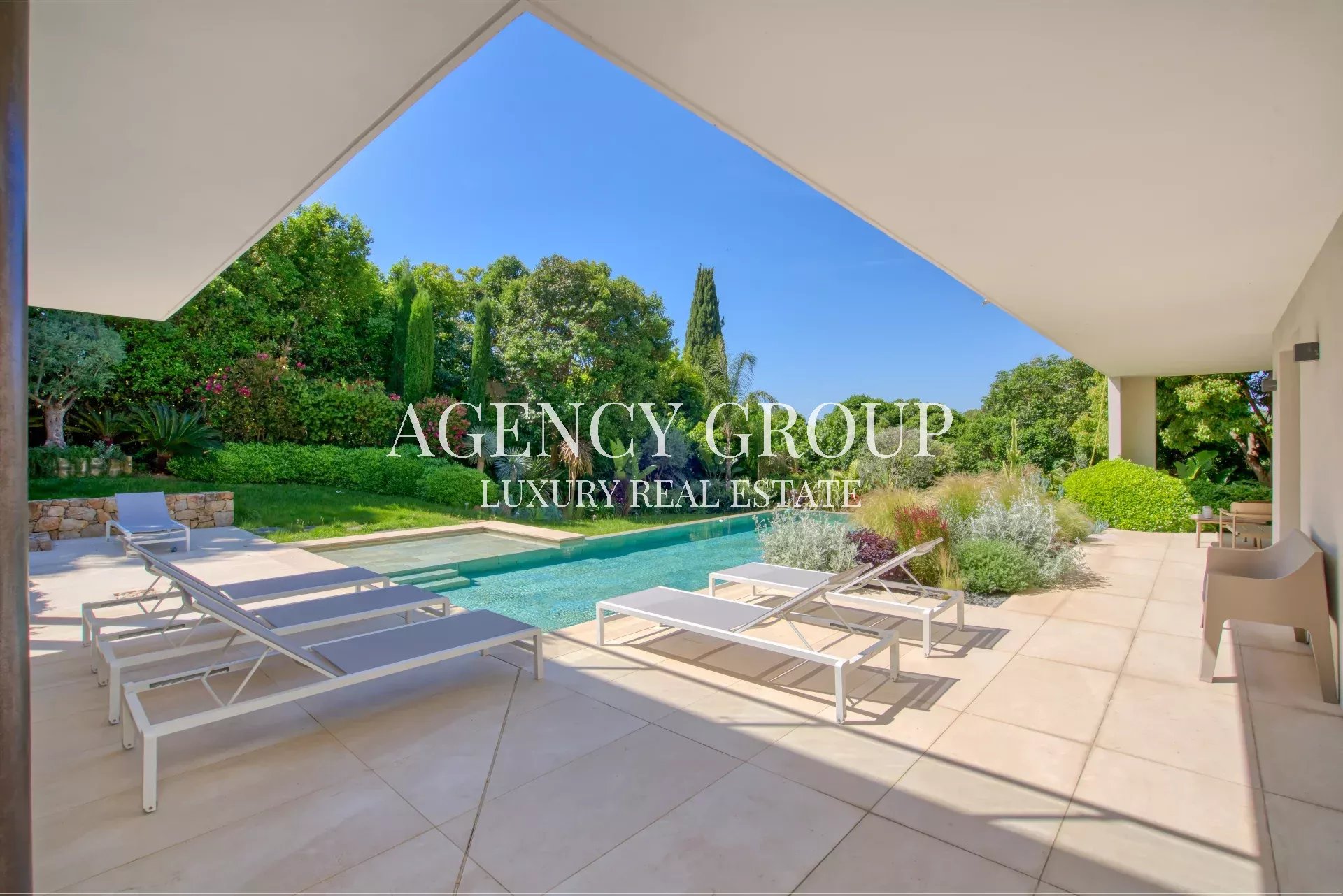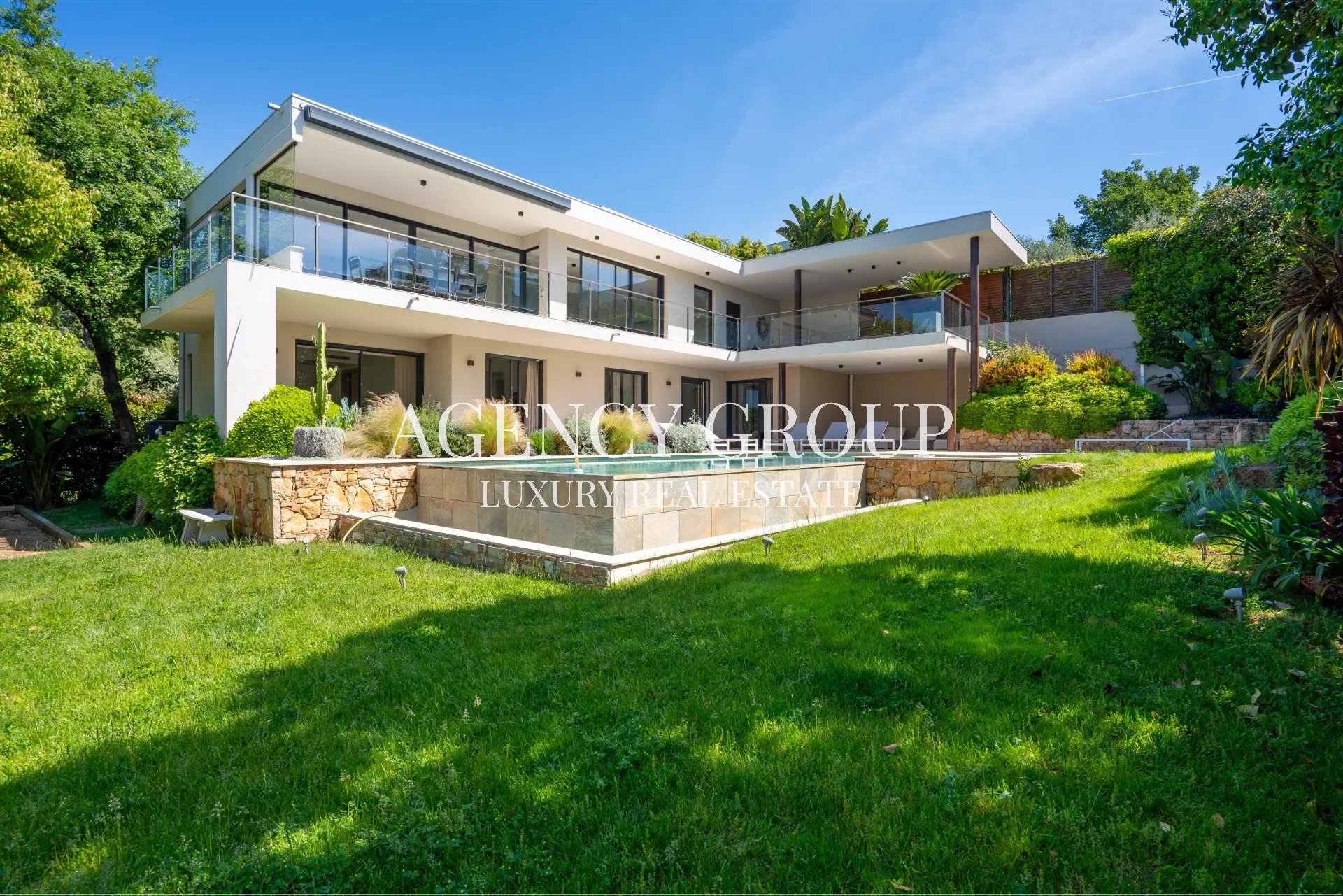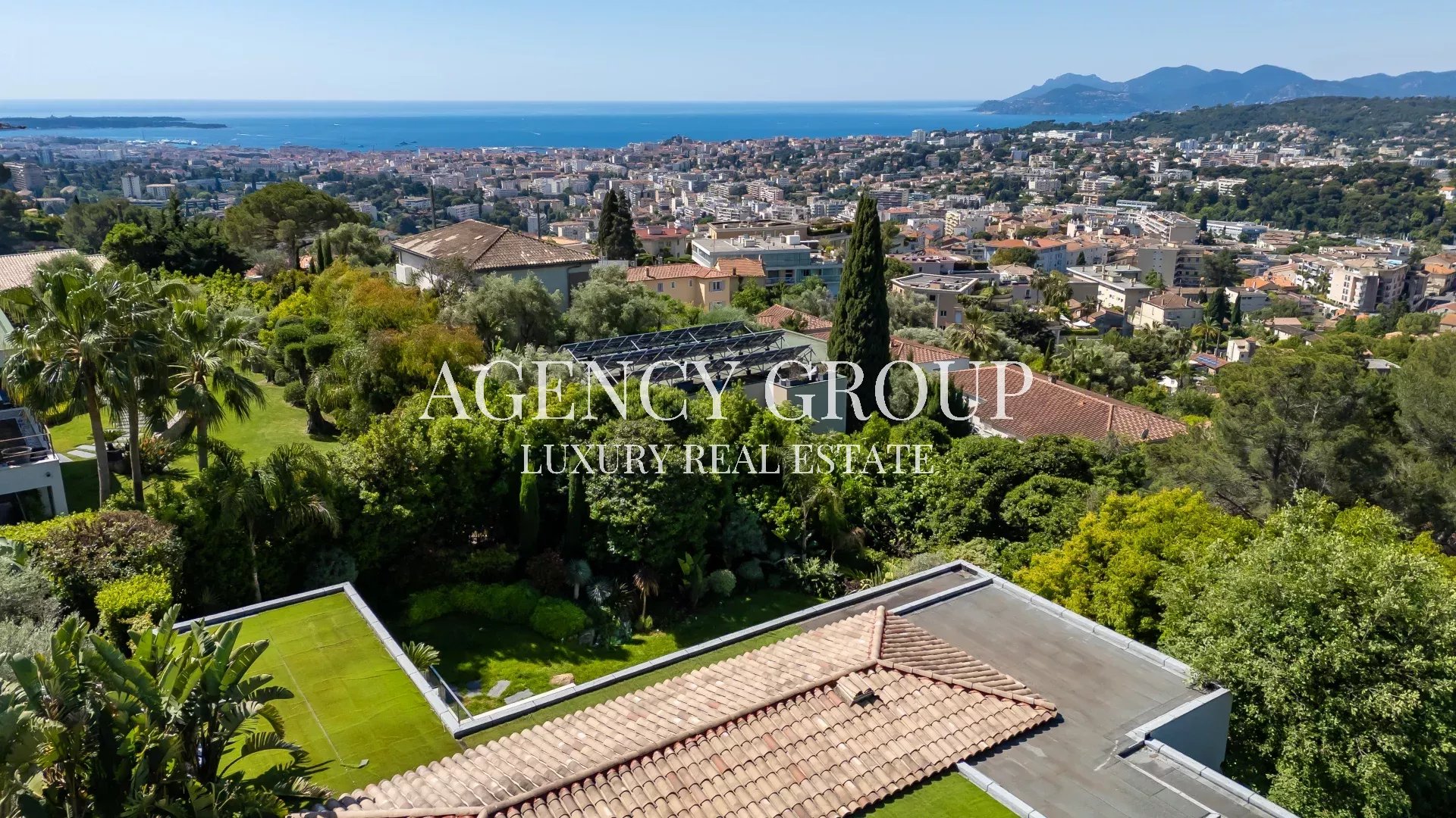 Near the Croisette and the Palais des Festival, in a residential area, this magnificent contemporary villa with clean lines has approximately 220 sqm, and is located on landscaped and wooded grounds of 1380 sqm