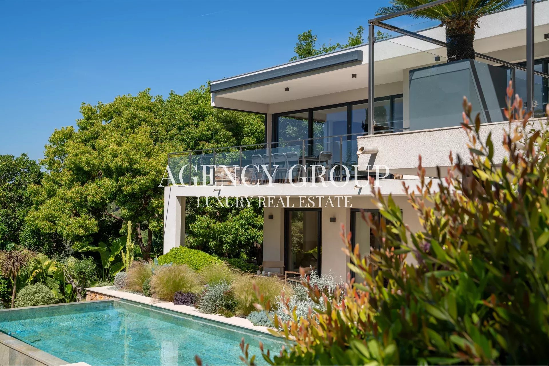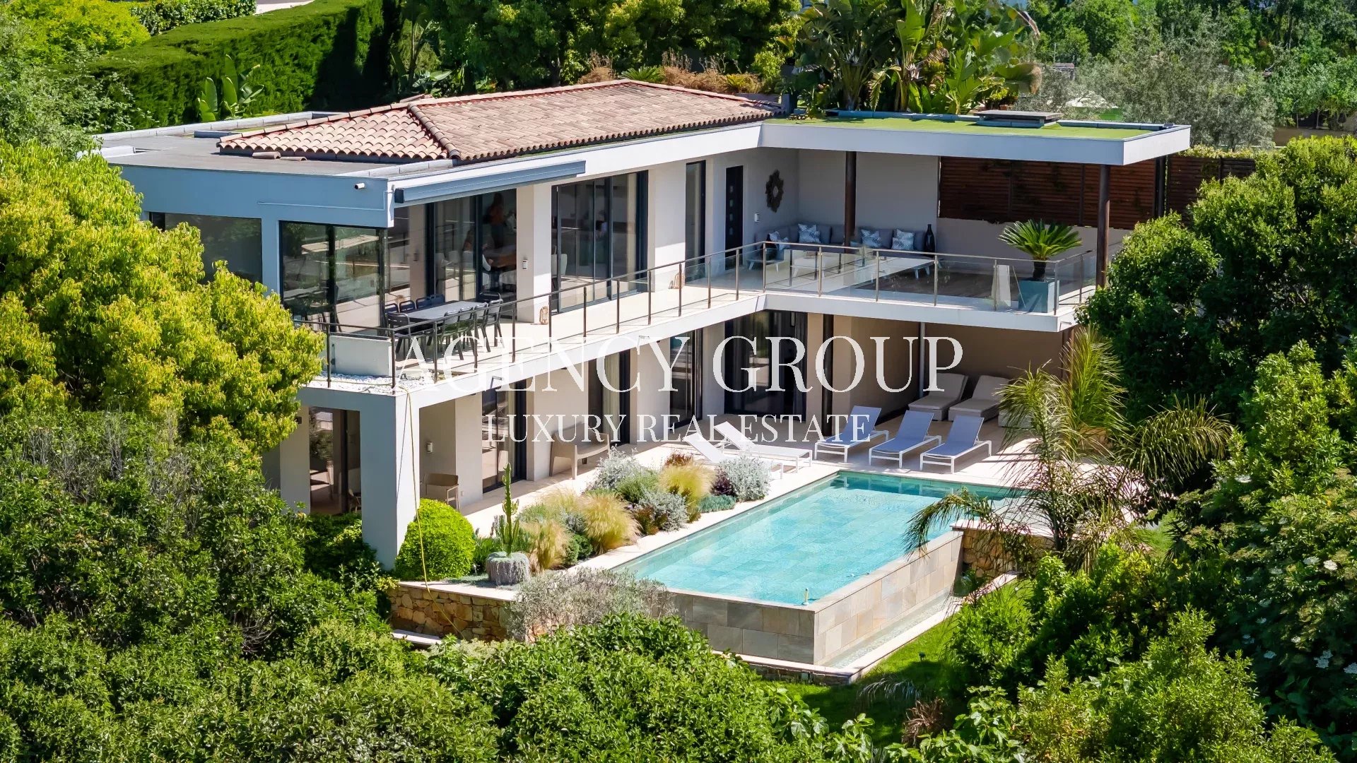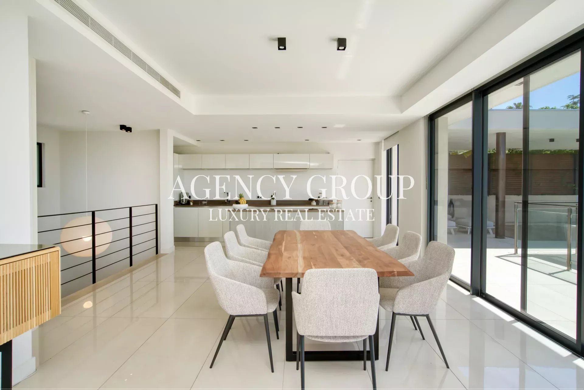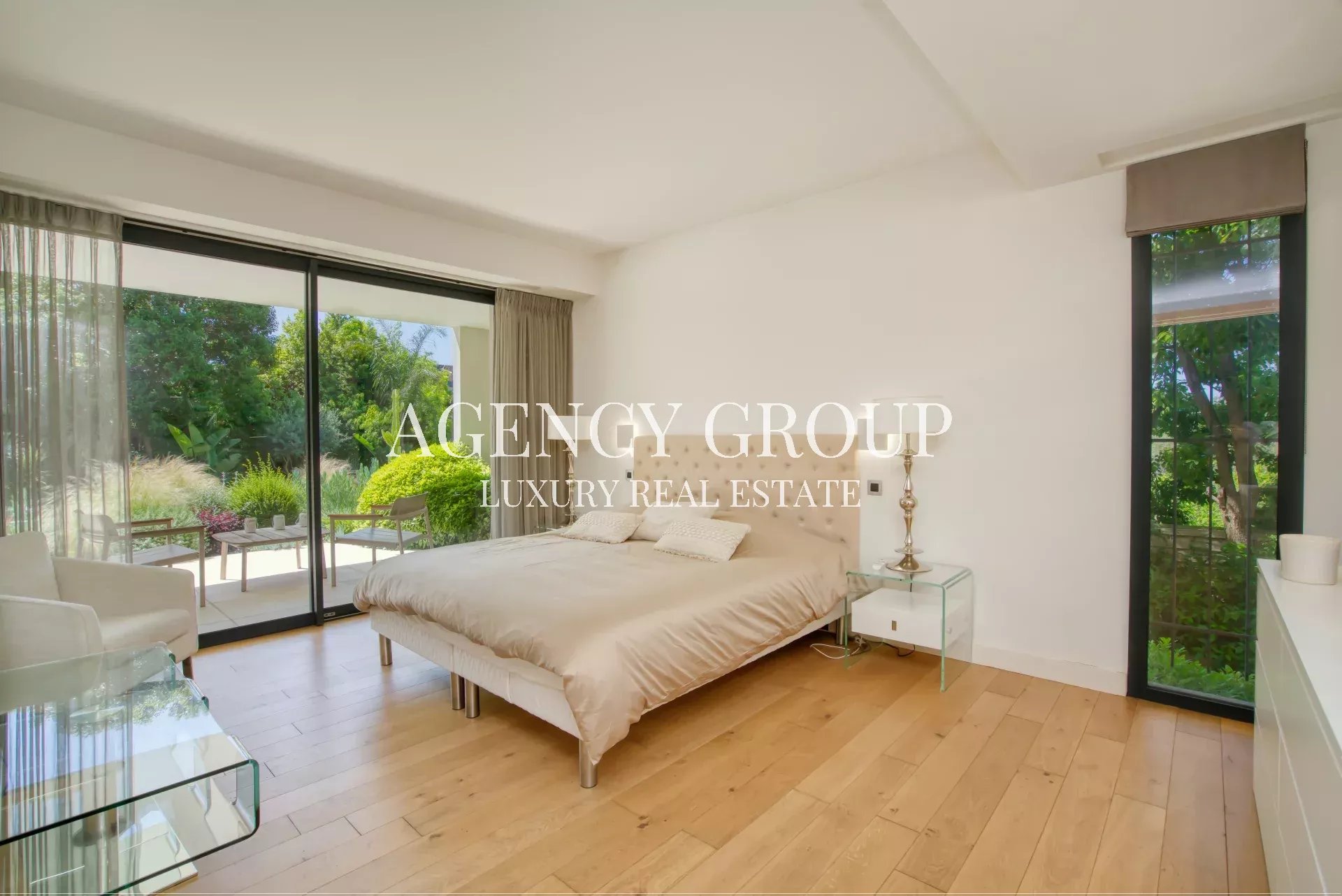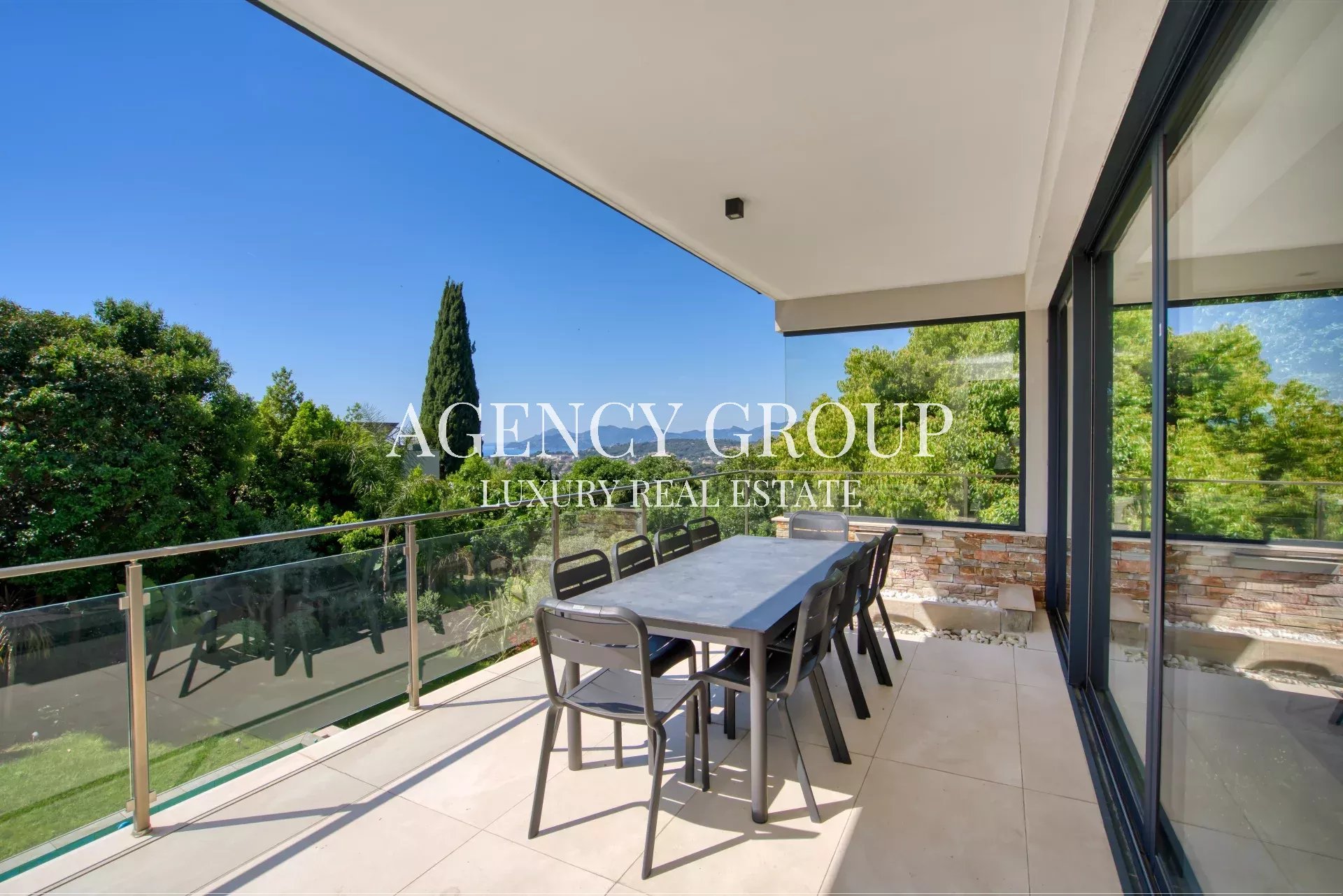Near the Croisette and the Palais des Festival, in a residential area, this magnificent contemporary villa with clean lines has approximately 220 sqm, and is located on landscaped and wooded grounds of 1380 sqm